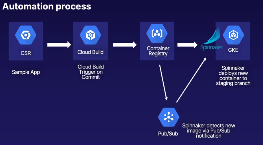 • CSR, Cloud Build trigger, Cloud Builder file, custom app backends, K8's YAML files for Spinnaker, Container Registry Vulnerability scanning